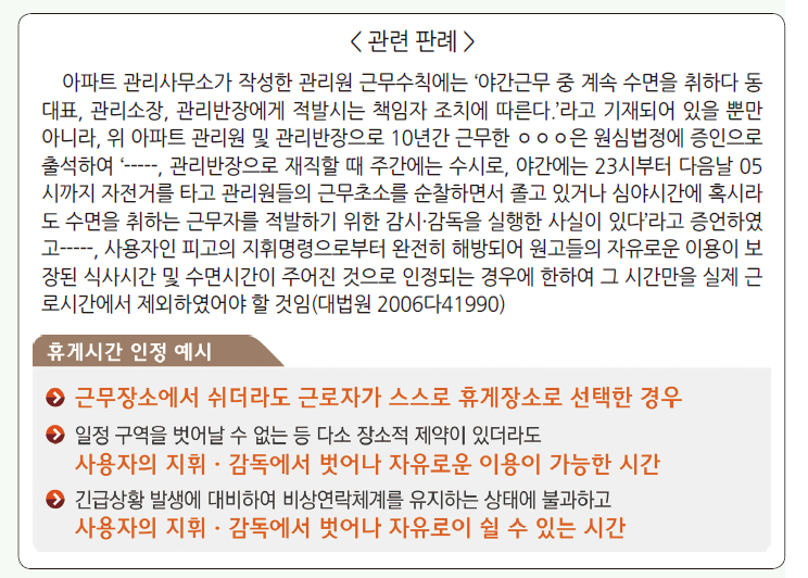 °¡À̵å¶óÀο¡ µû¸£¸é, ±Ù·Î°è¾à¿¡¼­ Çü½ÄÀûÀ¸·Î ÈްԽð£À¸·Î ±ÔÁ¤ÇÏ´õ¶óµµ Á¦À糪 °¨½Ã¡¤°¨µ¶ µî¿¡ ÀÇÇØ ±Ù¹«Àå¼Ò¿¡¼­ °­Á¦·Î ´ë±âÇÏ´Â ½Ã°£Àº ±Ù·Î½Ã°£À¸·Î º¸´Â µî ±Ù·Î½Ã°£À¸·Î ÀÎÁ¤µÇ´Â °æ¿ì¸¦ »ç·Ê¿Í °ü·Ã ÆÇ·Ê, ÇàÁ¤Çؼ® µîÀ» ÅëÇØ ¸íÈ®È÷ Á¦½ÃÇÑ´Ù.